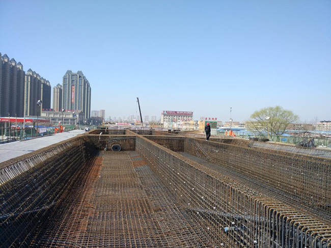 目前施工已大面積展開,截止到3月6日,綜合管廊支護(hù)開挖累計(jì)完成740米,主體結(jié)構(gòu)澆筑完成460米;高架橋箱梁累計(jì)完成兩聯(lián),70聯(lián)鋼筋綁扎已完成,74聯(lián)箱梁支架正在搭設(shè)。
