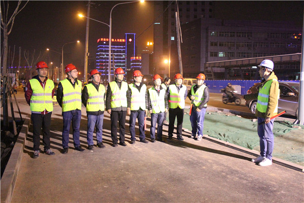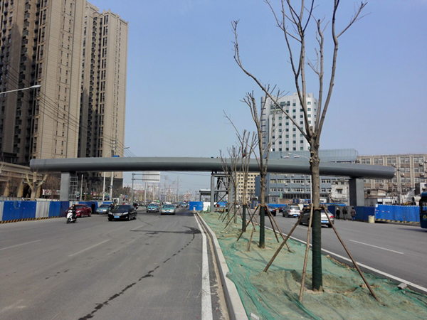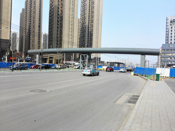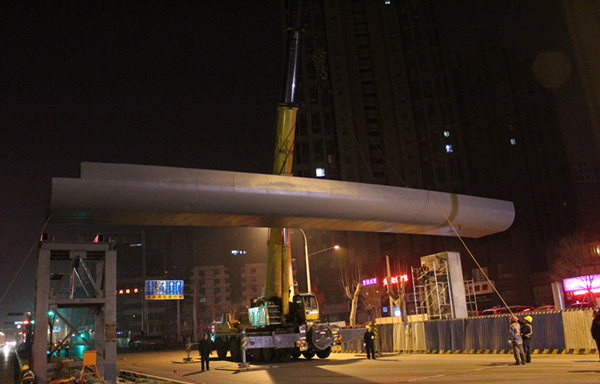 濟南市市政工程有限公司承建的緯十二路人行天橋工程包含兩座天橋,分別位于經二路南側和經五路南側,均橫跨緯十二路。天橋兩側緊臨普通公交站臺,中間與BRT站臺相接,橋梁上部結構采用鋼箱梁,橋梁全長60米,寬4米,共3跨,下部結構采用鋼板墩,共設置5處步梯及3部垂直升降電梯,梯道寬2.5米。3月16日晚至3月17日凌晨,濟南市市政工程有限公司項目部進行經五路南側人行天橋主箱梁吊裝施工。