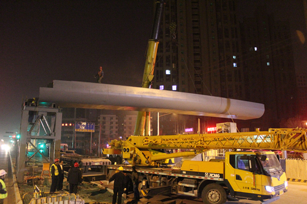 濟南市市政工程有限公司緯十二人行天橋工程進行主箱梁吊裝施工
