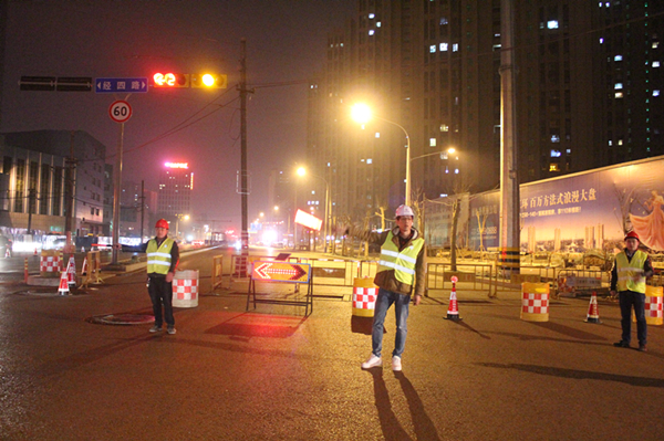 為保證吊裝工作順利進行,濟南市市政工程有限公司項目部提前策劃,與交警等相關部門充分溝通確定交通組織方案,建立吊裝安全保障小組并明確人員分工;同時為保證后續(xù)施工道路交通安全,濟南市市政工程有限公司項目部在南北兩側設立了臨時限高桿。3月16日晚11時現場正式封閉西半幅快車道吊裝西段主梁,在東半幅快車道中間進行隔離,南行及北行車輛分車道行駛,盧浮公館小區(qū)東門與緯十二路交叉口在西側箱梁吊裝期間進行封閉,車輛及行人繞行小區(qū)西門或南門。西段主梁吊裝完成后封閉東半幅快車道,吊裝東段主梁。濟南市市政工程有限公司于3月17日凌晨4時完成經五路人行天橋主箱梁吊裝施工。