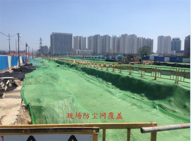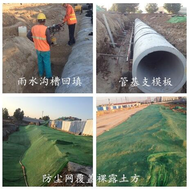 進(jìn)行雨水管基施工,溝槽回填及現(xiàn)場防塵網(wǎng)覆蓋工作