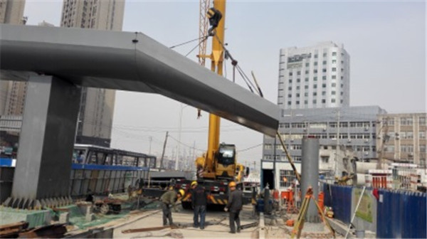 321日,緯十二路道路工程經(jīng)五路人行天橋進行梯道安裝,慢車道進行水穩(wěn)攤鋪施工。